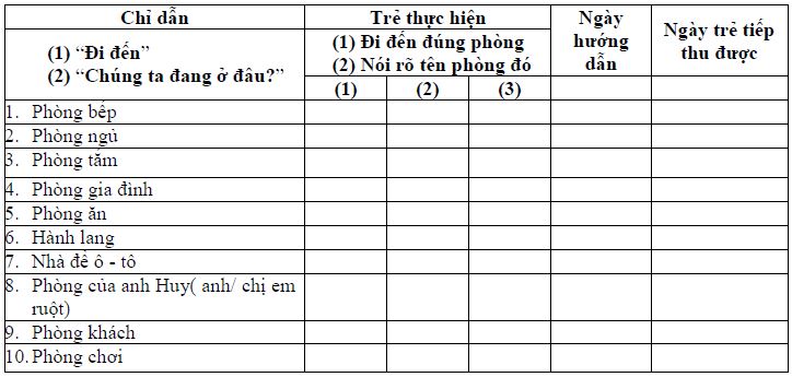 (1). Xác định vị trí của phòng: Ngồi hoặc đứng đối diện với trẻ để tạo sự tập trung chú ý. Bảo trẻ “Đi đến…….(tên của phòng)”. Hướng dẫn trẻ đi đến đúng phòng và khen và thưởng cho trẻ.