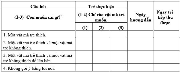 (3). Chỉ vào đồ vật ở trên bàn: Để 1 vật mà trẻ thích và một vật mà trẻ không thích lên bàn xa tầm tay của trẻ. Hỏi trẻ “Con muốn cái gì?”. Hướng dẫn trẻ chỉ về phía vật mà trẻ thích. Ngay lập tức đưa thứ đó cho trẻ.