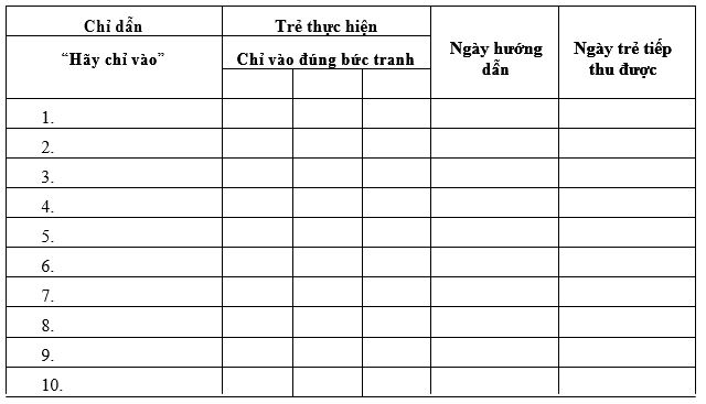 Hướng dẫn trẻ chỉ vào đúng bức tranh và khen thưởng việc làm theo chỉ dẫn của trẻ. Bạn hãy gợi trẻ ít dần đi trong các lần dạy tiếp theo. Trẻ làm theo chỉ dẫn của bạn bằng cách khác nhau vơi sự hỗ trợ ở mức độ thấp nhất. Cuối cùng chỉ khen thưởng những lần trẻ làm đúng chỉ dẫn mà không cần nhắc .