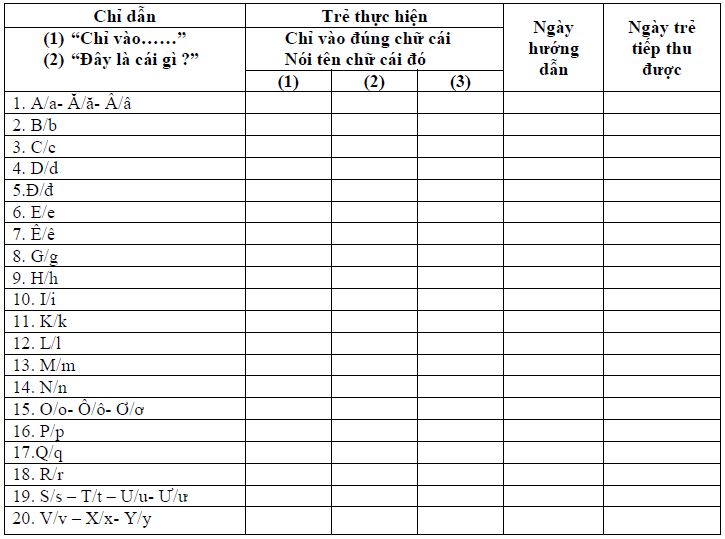Giải thích cách đánh giá khả năng tiếp thu của trẻ: Đánh dấu “+” vào ô số:
