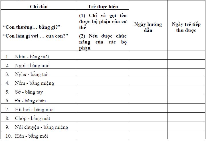 - Biết tên bộ phận cơ thể theo chức năng: Ngồi trên ghế đối diện với trẻ. Yêu cầu trẻ chú ý và hỏi “Con ...... (một chức năng nào đó, ví dụ: ăn) bằng gì?”. Gợi ý cho trẻ chỉ đúng và nói tên bộ phận cơ thể. Khen và thưởng cho câu trả lời của trẻ. Càng về sau càng giảm gợi ý cho trẻ, dần dần chỉ khen và thưởng khi trẻ trả lời đúng mà ít phải gợi ý nhất. Cuối cùng, chỉ khen và thưởng những khi trẻ trả lời đúng mà không cần gợi ý.