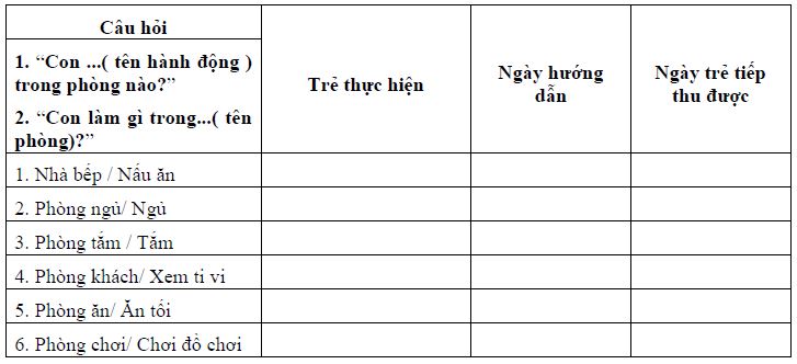 - Điều kiện trước tiên: Trẻ nhận biết được các phòng, chức năng của đồ vật, hành động.