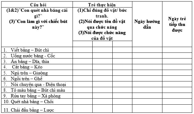 (3). Nói được chức năng của đồ vật: Ngồi lên ghế đối diện với trẻ và tạo sự tập trung chú ý. Hỏi trẻ “Con làm gì với……..(tên đồ vật)”? Ví dụ “Con làm gì bằng chiếc bút chì này?”. Khen và thưởng cho trẻ. Bạn hãy gợi ý trẻ ít dần đi trong các lần dạy tiếp theo. Trẻ trả lời câu hỏi của bạn bằng các cách khác nhau với sự hỗ trợ ở mức độ thấp nhất. Cuối cùng chỉ khen thưởng những lần trẻ trả lời đúng mà không cần nhắc.