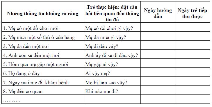Ngồi trên ghế ngang hàng với trẻ. Yêu cầu trẻ chú ý và nói với trẻ một câu không rõ ràng, (ví dụ: “Hôm qua mẹ đã đến một nơi”). Gợi ý cho trẻ đặt câu hỏi liên quan đến thông tin đó (ví dụ: “Mẹ đi đâu vậy?”). Khen thưởng lại cách thực hiện của trẻ đồng thời trả lời câu hỏi đó (ví dụ: “Mẹ đến cơ quan”), càng về sau càng giảm gợi ý cho trẻ, cuối cùng chỉ khen thưởng trẻ làm đúng mà không cần gợi ý.