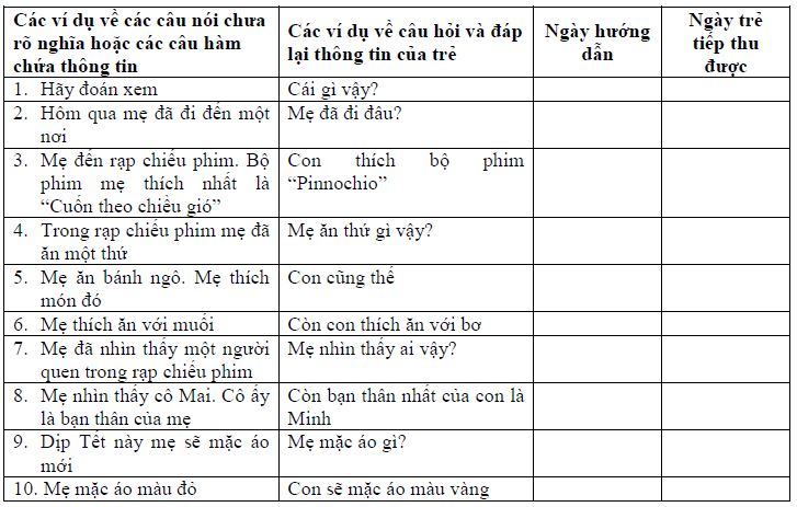 Ngồi trên ghế đối diện với trẻ. Yêu cầu trẻ chú ý và đưa ra một câu không rõ nghĩa (ví dụ: “Hôm qua mẹ đã đi đến một nơi để xem phim”) hoặc nói với trẻ một câu để trẻ có thể trao đổi (ví dụ: “Mẹ thích ăn khoai tây chiên”). Gợi ý cho trẻ hỏi một câu hỏi liên quan đến một câu nói trước của bạn (ví dụ: “Mẹ đã đi đâu?”) hoặc trao đổi thông tin: (ví dụ: “Con thích ăn bánh quy”). Khen và thưởng cho trẻ, nếu trẻ hỏi bạn hãy trả lời câu hỏi đó (ví dụ: “Mẹ đi đến rạp chiếu phim”), đồng thời giảm gợi ý cho trẻ. Dần dần khen và thưởng cho trẻ mà ít phải gợi ý nhất. Cuối cùng, chỉ khen và thưởng những khi trẻ trả lời đúng mà không cần gợi ý.