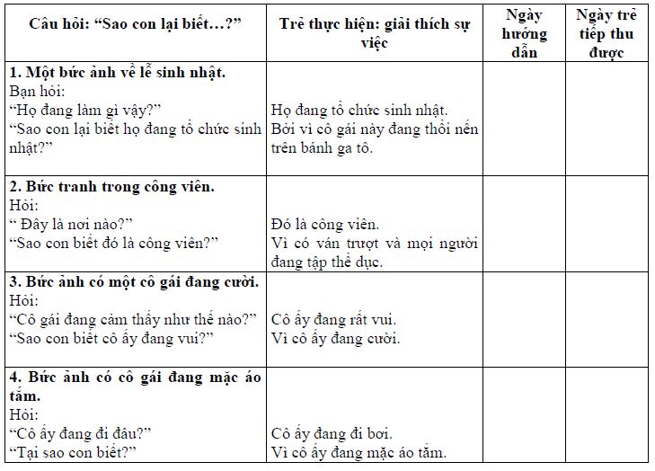 Ngồi trên ghế ngang hàng với trẻ. Yêu cầu trẻ chú ý và cho trẻ xem một bức tranh/ ảnh trên đó mô tả một sự việc hoặc phong cảnh (ví dụ: ảnh trong nhà bếp, ảnh một người đang làm bánh, ảnh một bãi biển). Hãy hỏi trẻ câu hỏi về một trong các bức tranh/ ảnh đó (ví dụ: cho trẻ xem bức tranh về mùa đông, hỏi trẻ: “Đây là mùa gì?”). Sau khi trẻ trả lời “Mùa đông”, hãy hỏi tiếp: “Sao con biết… … (đây là mùa đông)?”. Gợi ý cho trẻ giải thích (ví dụ: “Bởi vì con nhìn thấy tuyết rơi”). Khen thưởng lại cách thực hiện của trẻ, càng về sau càng giảm gợi ý cho trẻ. Cuối cùng chỉ khen thưởng những cách trẻ làm đúng mà không cần gợi ý.