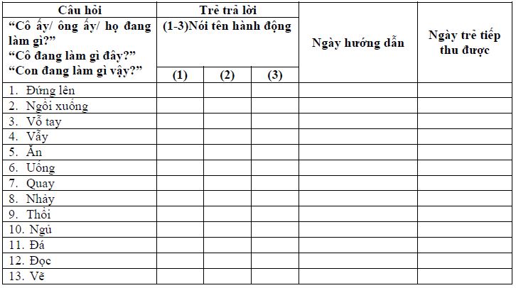 (3). Tự mình nói tên hành động: Hướng dẫn trẻ làm 1 hành động(hướng dẫn chân tay trẻ làm hành động đó hoặc làm mẫu hành động để trẻ bắt chước).Hỏi trẻ “Con đang gì vậy?’’.Hướng dẫn trẻ nói tên hành động đó.Khen và thưởng cho trẻ.