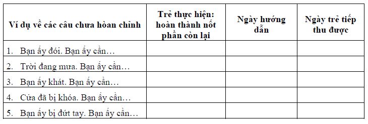 Ngồi trên ghế đối diện với trẻ. Yêu cầu trẻ chú ý và cho trẻ xem một bức tranh ảnh có liên quan đến các ví dụ bên dưới. Nói một câu chưa hoàn chỉnh (ví dụ: “Tay của bạn ấy bẩn. Bạn ấy phải......”). Gợi ý cho trẻ hoàn thành nốt câu đó (ví dụ “Bạn ấy phải rửa tay”). Khen thưởng lại cách thực hiện của trẻ, càng về sau càng giảm gợi ý cho trẻ. Cuối cùng khen thưởng những cách trẻ làm đúng mà không cần gợi ý.