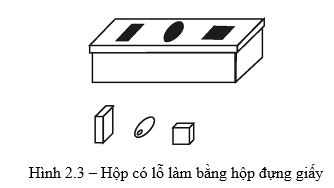 Dụng cụ: Hộp giày, 3 đồ vật có chiều kích và hình thể đa dạng (ví dụ 1 hạt chuỗi, 2 khối chiều kích và hình dạng khác nhau).