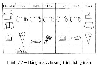 - Mỗi buổi sáng bạn dẫn trẻ đến trước bảng và giải thích bảng cho trẻ. Bắt đầu bằng những gì trẻ sẽ làm trong ngày, bạn nói “ Con nhìn, hôm nay con sẽ đi học, sẽ có mì sợi vào bữa cơm tối và sẽ xem truyền hình”. Bạn nhấn mạnh “hôm nay” và yêu cầu trẻ lặp lại những gì trẻ sẽ làm.