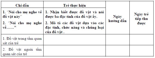 - Ngoài tầm quan sát của trẻ: Mô tả các đồ vật trẻ nhìn thấy, nhận biết được chủng loại, đặc tính, chức năng của đồ vật, nhắc lại các cụm từ.