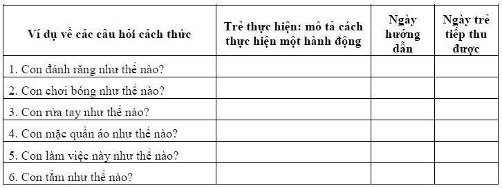 - Gợi ý cách dạy: Làm mẫu cách thực hiện cho trẻ. Nếu trẻ biết đọc, hãy sử dụng các gợi ý được viết sẵn ra giấy (ghi các mô tả cách thức cho trẻ đọc) và giảm dần gợi ý cho trẻ theo cách này qua từng tiết dạy.