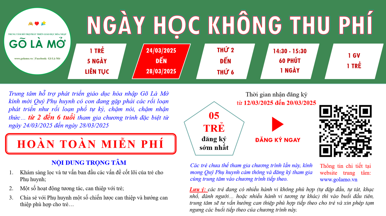 Trung tâm hỗ trợ phát triển giáo dục hòa nhập Gõ Là Mở kính mời Quý Phụ huynh có con đang gặp phải các rối loạn phát triển như rối loạn phổ tự kỷ, chậm nói, chậm nhận thức… từ 2 đến 6 tuổi tham gia chương trình đặc biệt từ ngày 24/03/2025 đến 28/03/2025