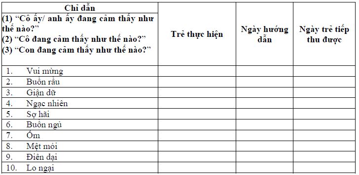 - Điều kiện trước tiên: Xác định được cảm xúc trong ảnh, đồ vật, hành động và người thân.