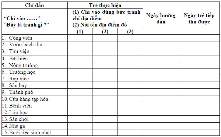 (2). Nói tên địa điểm: Ngồi lên ghế đối diện với trẻ và tạo sự tập trung chú ý. Đưa ra một bức tranh chỉ địa điểm và nói “Đây là tranh gì?”. Hướng dẫn trẻ nói được tên địa điểm đó.