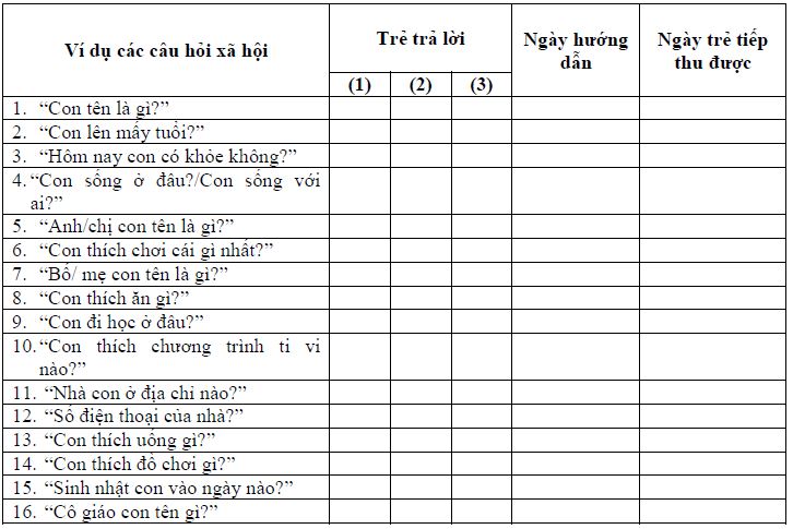 Ngồi lên ghế ngang với trẻ. Tạo sự tập trung chú ý và hỏi 1 câu hỏi xã hội. Hướng dẫn trẻ trả lời câu hỏi đó và thưởng cho trẻ. Bạn hãy gợi ý trẻ ít dần đi trong các lần dạy tiếp theo. Trẻ làm theo chỉ dẫn của bạn hoặc trả lời bằng các cách khác nhau với sự hỗ trợ ở mức độ thấp nhất. Cuối cùng chỉ khen thưởng những lần trẻ làm đúng theo chỉ dẫn hoặc trả lời mà không cần nhắc.