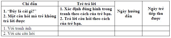 - Gợi ý cách dạy: Yêu cầu trẻ quan sát cách thực hiện, làm mẫu cách trả lời theo bạn của trẻ (ví dụ: “Đúng rồi, đó là… (tên của đồ vật trong tranh)”).