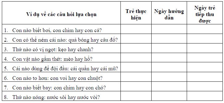 Giải thích cách đánh giá khả năng tiếp thu của trẻ: Đánh dấu “+” vào ô số: