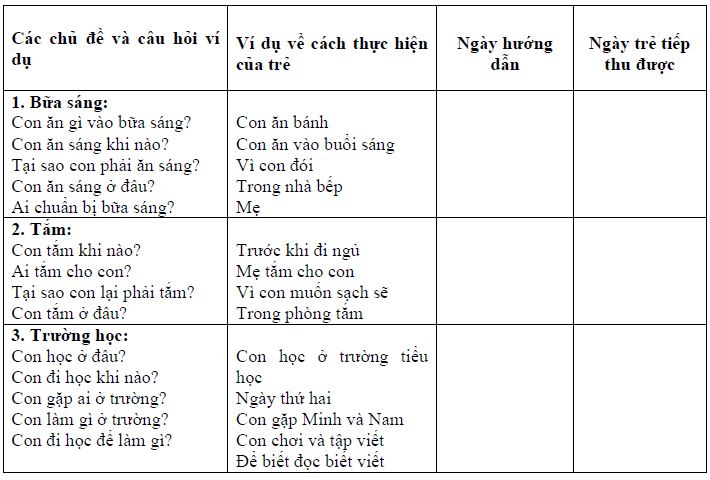 Giải thích cách đánh giá khả năng tiếp thu của trẻ: Đánh dấu “+” vào ô số: