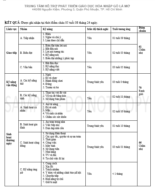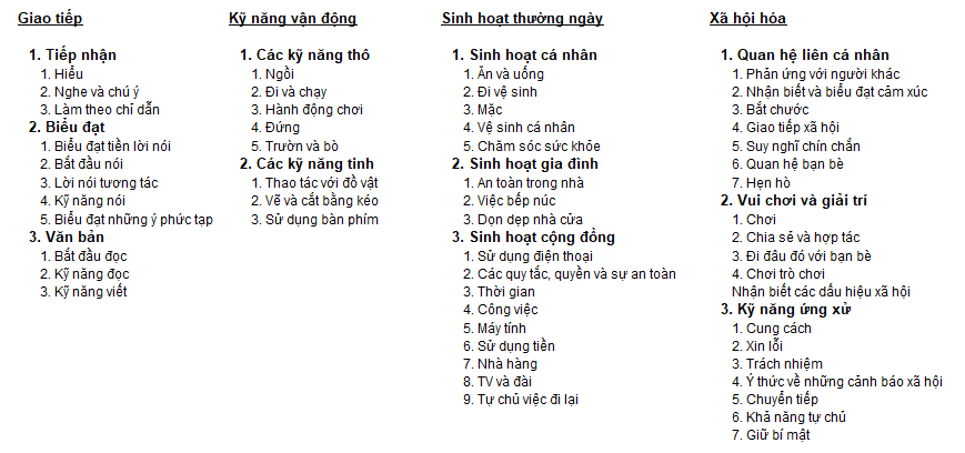 gồm có các nhóm: GIAO TIẾP - KỸ NĂNG VẬN ĐỘNG - SINH HOẠT THƯỜNG NGÀY - XÃ HỘI HÓA - Hành vi kém thích ứng (nhóm phụ)